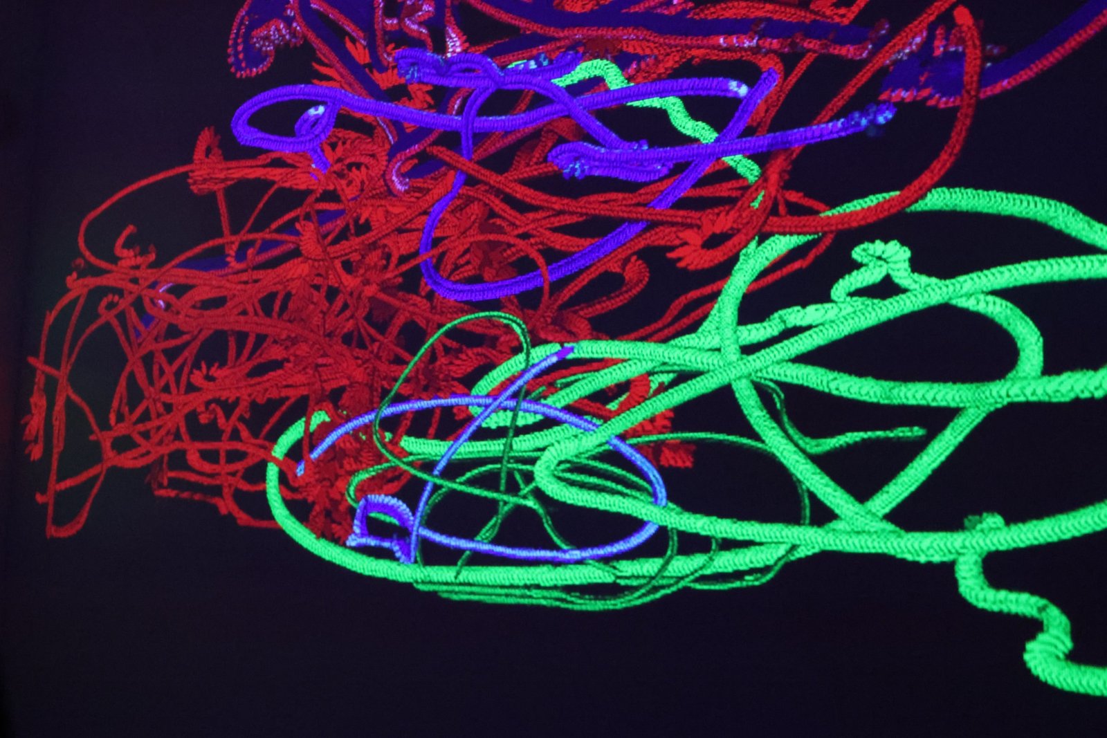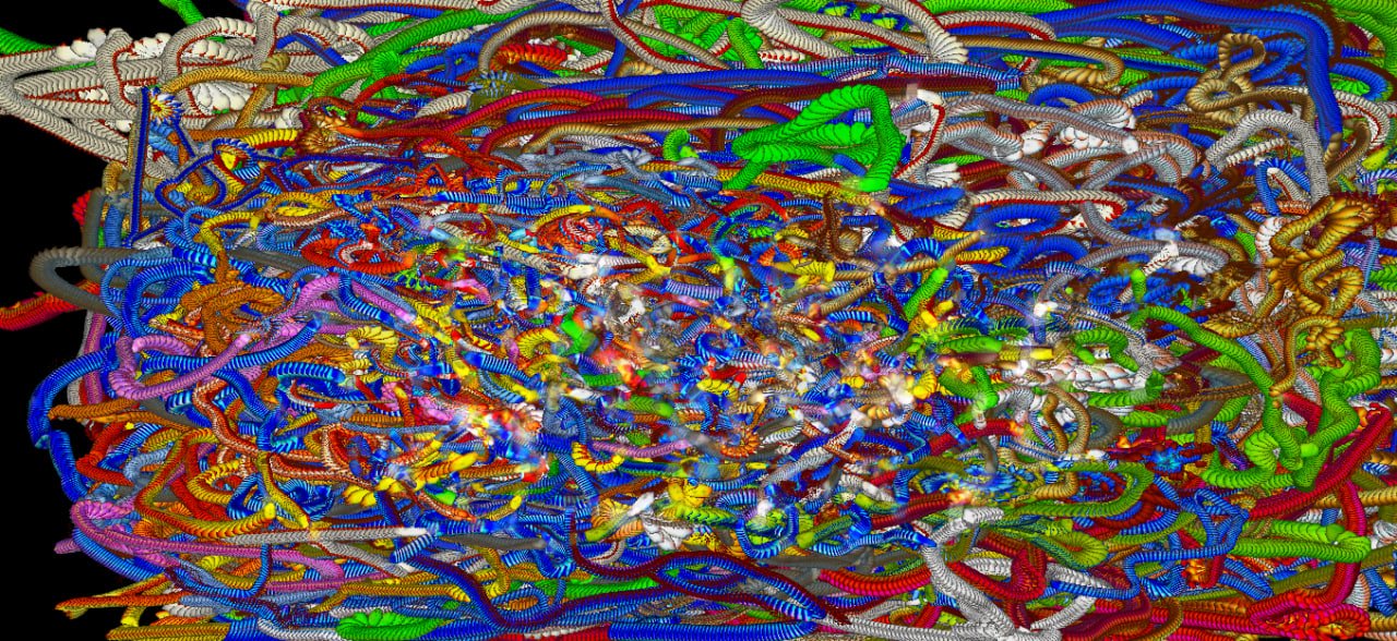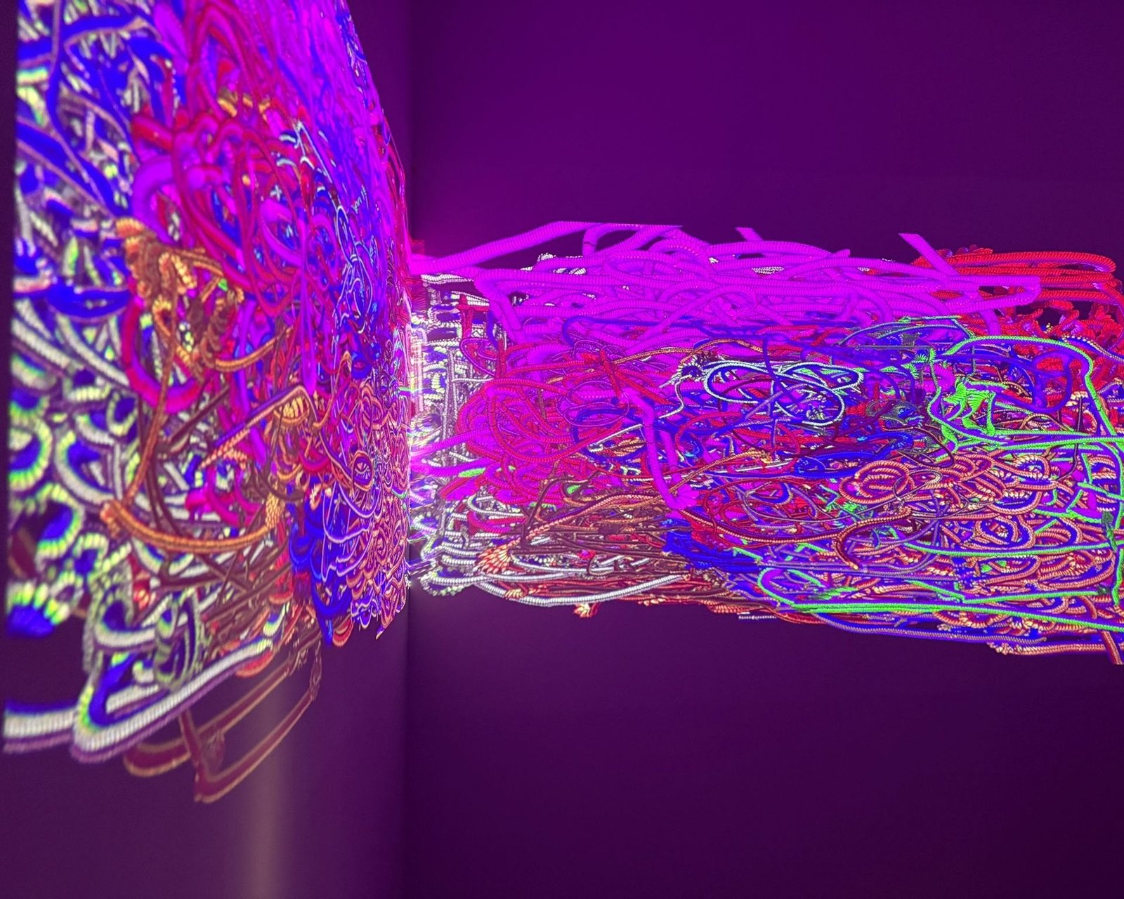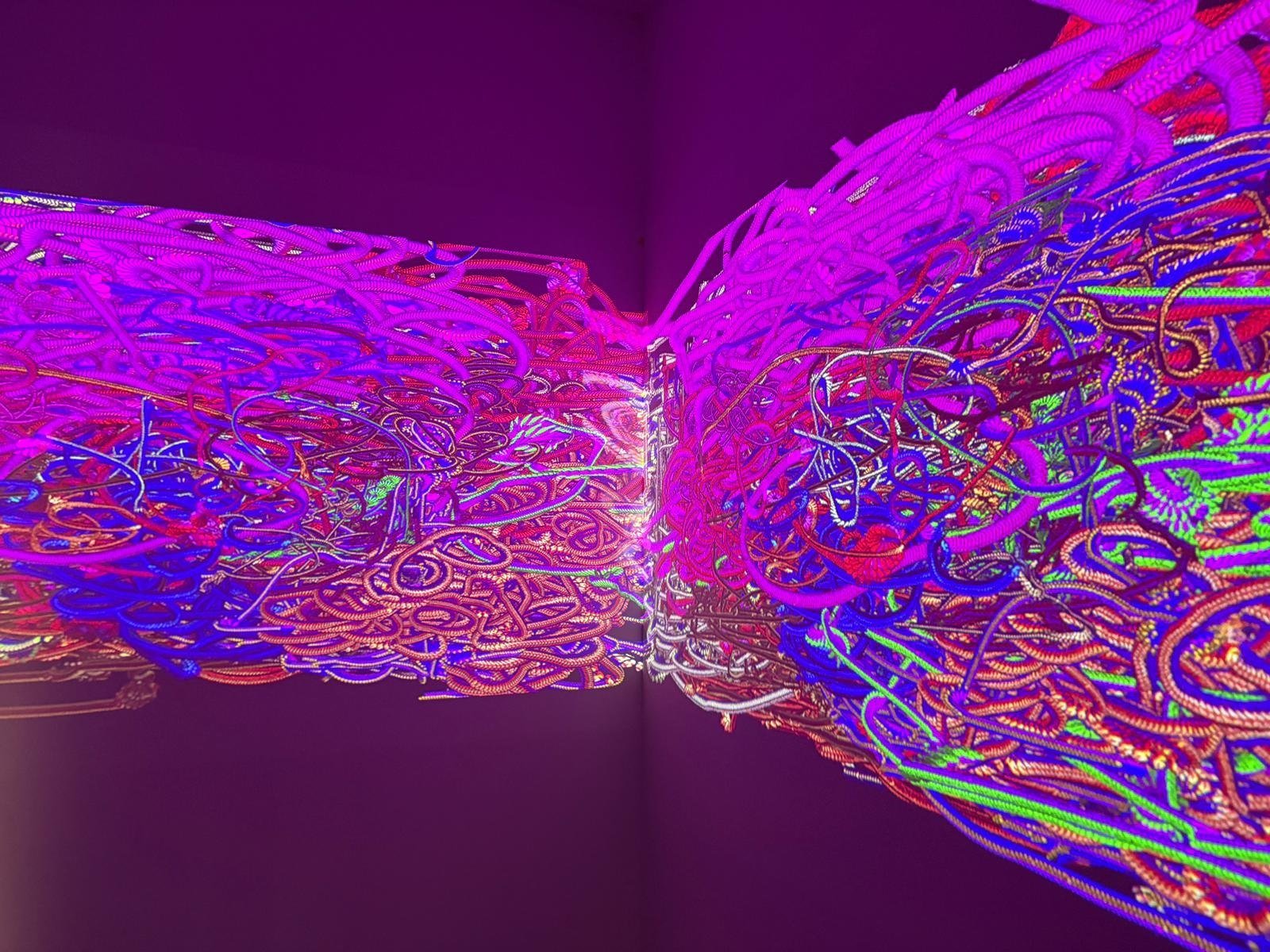 Formally, the work manifests itself as an expanding density: a web of filaments and chromatic torsions against a dark background, as if the image were woven from impulses, vines, nerves, or affective cartographies. The visual matter appears both “painted” and programmed at once: there is gesture, but also system; there is composition, but no definitive center. The aesthetic functions as an homage to traditional languages, painting, weaving, the graphic quality of the stroke, relocated within an algorithmic regime in which the “brush” is the flow of data and time is one more layer of color.