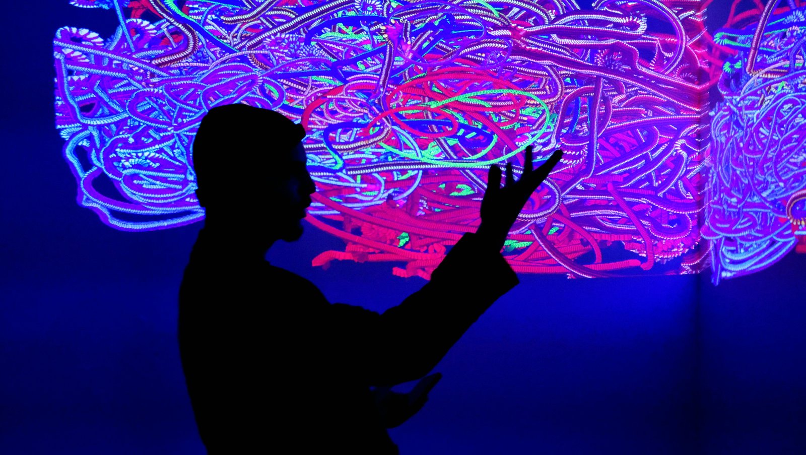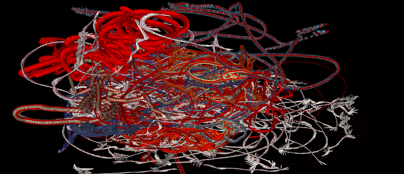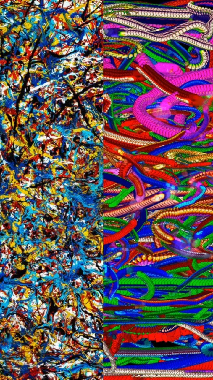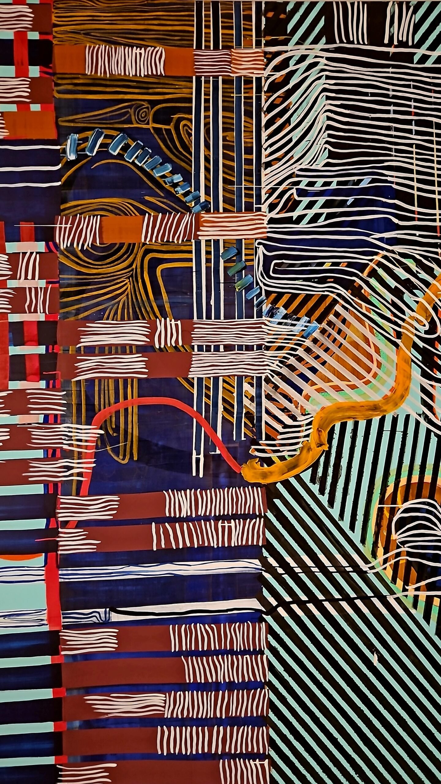 Formally, the work manifests itself as an expanding density: a web of filaments and chromatic torsions against a dark background, as if the image were woven from impulses, vines, nerves, or affective cartographies. The visual matter appears both “painted” and programmed at once: there is gesture, but also system; there is composition, but no definitive center. The aesthetic functions as an homage to traditional languages, painting, weaving, the graphic quality of the stroke, relocated within an algorithmic regime in which the “brush” is the flow of data and time is one more layer of color.