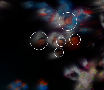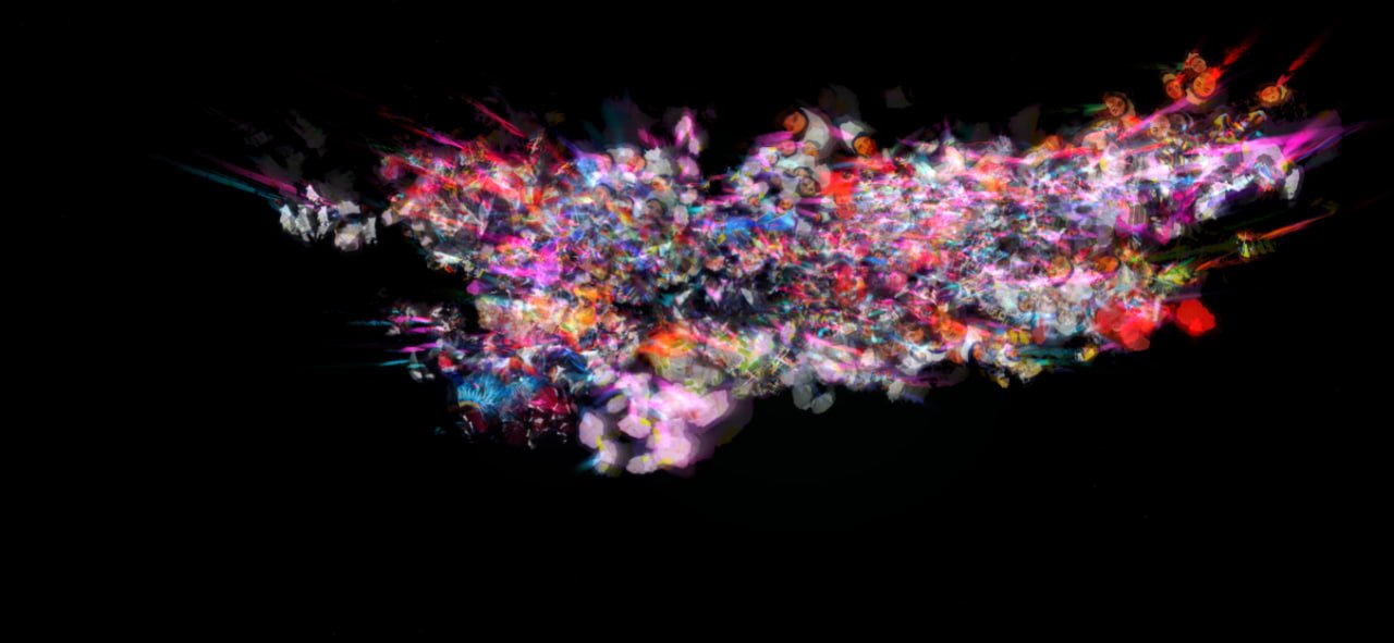 In this fragment, one can observe the technique through which the portrait functions as “pigment” within the system. Each captured photograph is incorporated as a digital texture that the algorithm decomposes into samples of color and luminance. Rather than appearing as a stable image, the portrait is fragmented, blurred, and redistributed throughout space by means of a set of particles and moving traces calculated in real time.