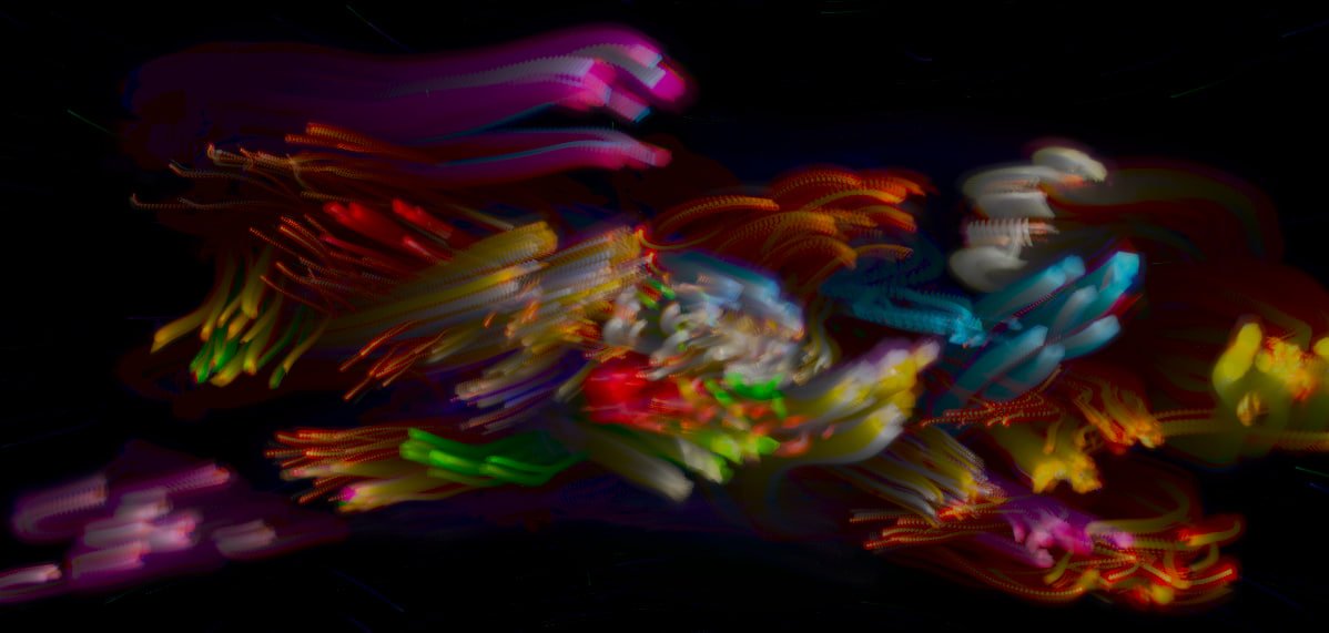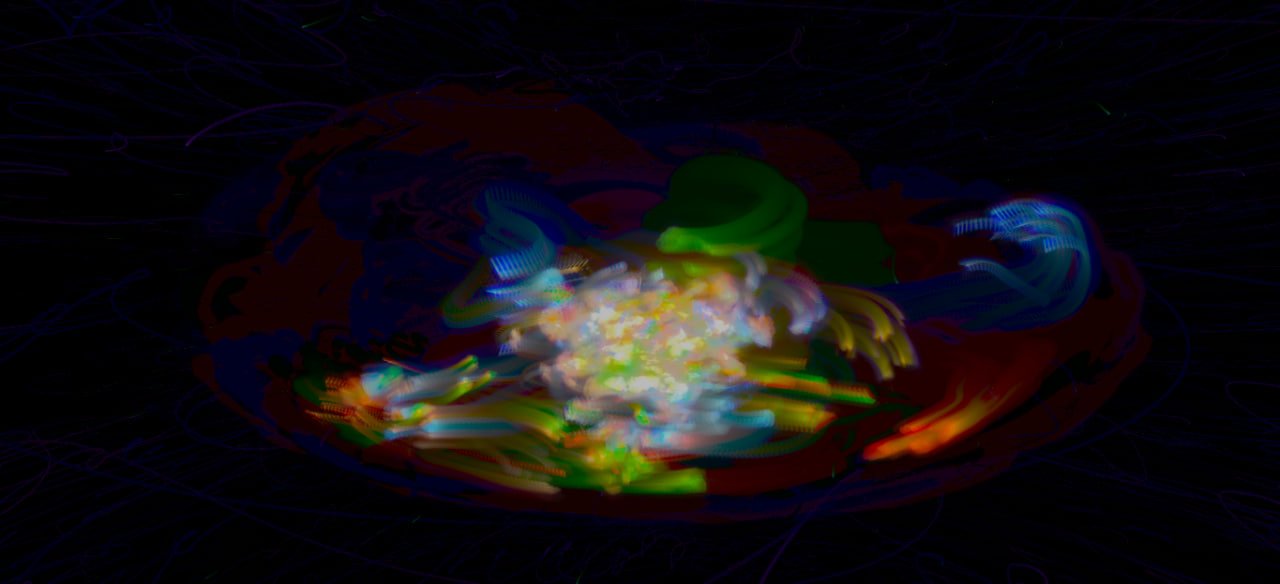 Within this dimension, concepts from physics and mathematics emerge as poetic tools: fluid dynamics, flows, vortices, drag, vector fields, directions, intensities, gradients, and forms of order that recall harmonics, frequencies that organize chaos without closing it off. The piece operates as an expanded painting in which color and light emerge from calculation: the image is the visible surface of an invisible architecture of data, forces, and relations. For this reason, the algorithm is not merely a technical means: it is part of the content, part of the authorship, part of the “body” of the work.