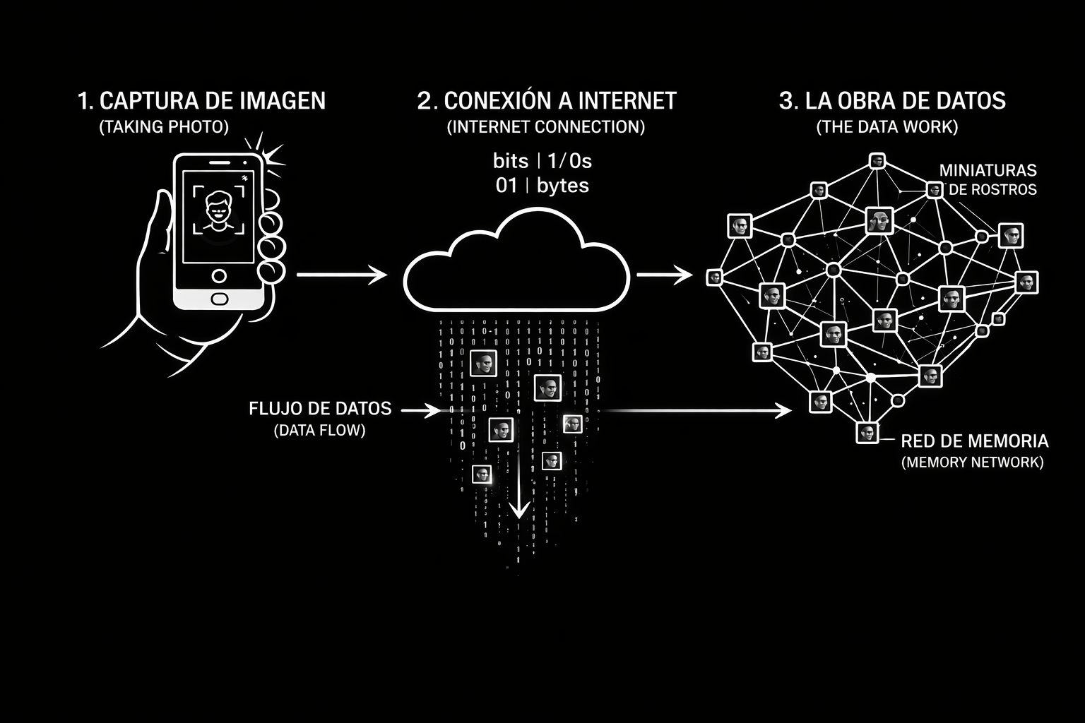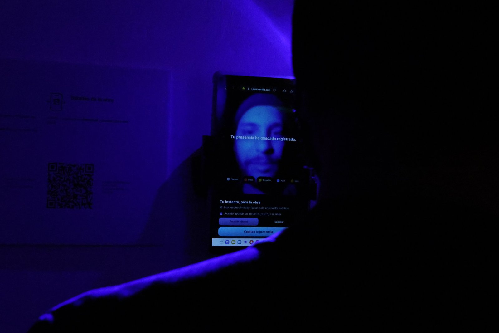 In this way, the selfie is understood as an act of permanence: “I was here.” That trace moves from physical space into digital space and reflects how we connect today, through networks, data, and images. In this work, memory is not archived: it is produced and set in motion.