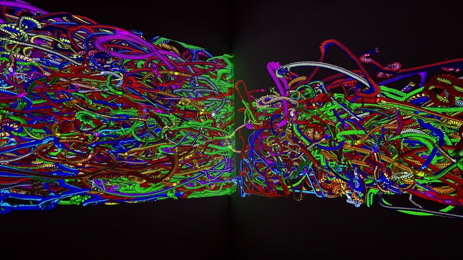 The central method was the concept of the seed. A seed is an initial idea, a minimal set of visual rules and parameters, movement, density, blending, light, and color, from which a family of results unfolds. As a version developed, its behavior within the exhibition space was evaluated. If the result did not achieve the desired tension, the process moved backward, returning to the seed in order to open a new path. In this way, the project grew through branching rather than linear accumulation: each decision generated a variant; each variant revealed a possible garden.